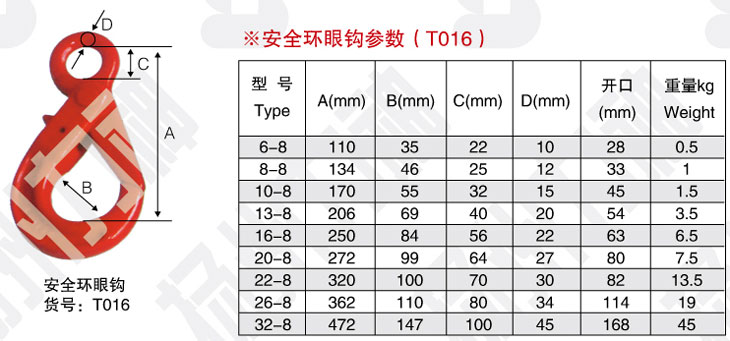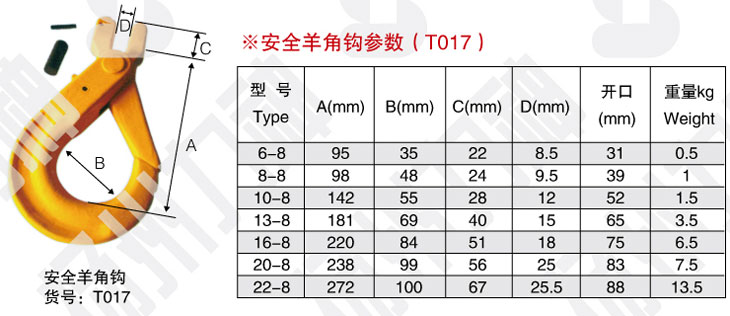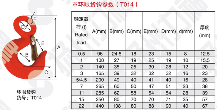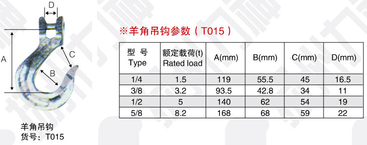 | 大開口吊鉤 | 集裝箱吊鉤 | 深開口吊鉤 | 貨號(ITEM NO):T011 | 貨號(ITEM NO):T012 | 貨號(ITEM NO):T013 | 3.2T、5T、8T、12T、15T | 5T、8T、10T | 5000LBS、7000LBS |